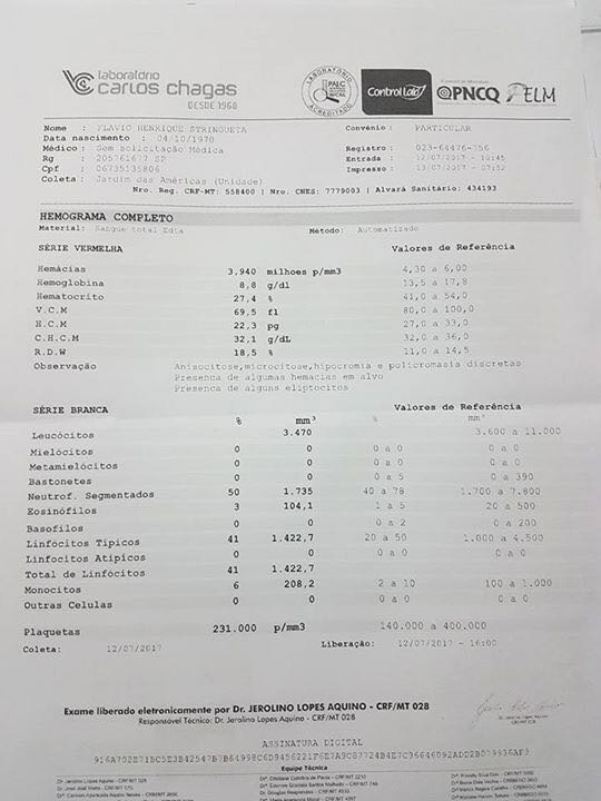 "Estou sendo obrigado a expor minha vida particular para que não especulem sobre meu afastamento das investigações dos grampos. Estou deixando as investigações por absoluta falta de condições físicas. Estou com uma doença auto-imune, incurável e crônica, que, para o seu controle, necessita de um ambiente tranquilo, sem picos de estresse", afirmou o delegado, que anexou na postagem um atestado médico e o resultado de um hemograma (veja abaixo).