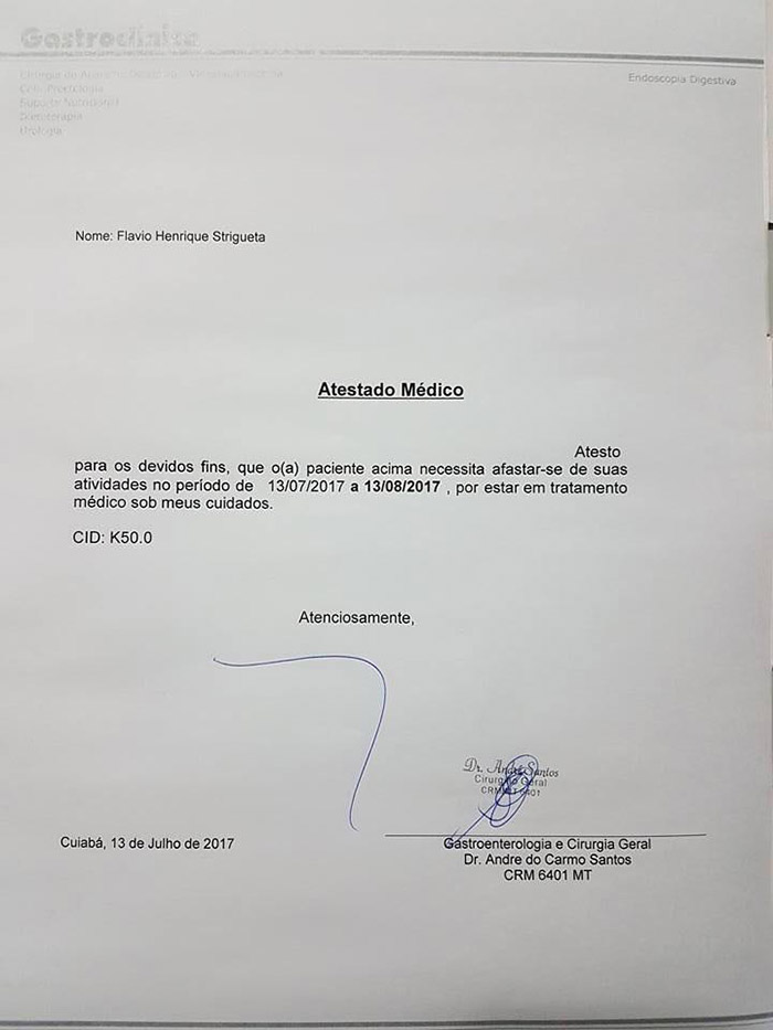 Veja abaixo o atestado e o hemograma postados pelo delegado: