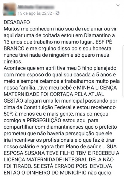 A primeira-dama de Diamantino (208 km a Médio-Norte de Cuiabá), Suzana Dalmolin Capistrano, bateu boca no Facebook com uma servidora que reclamou do corte de sua licença-maternidade.