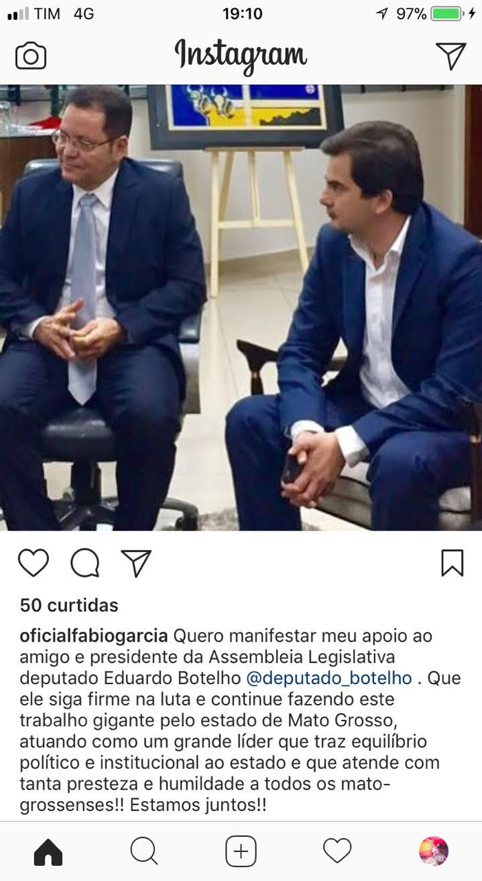 “Quero manifestar meu apoio ao amigo e presidente da Assembleia Legislativa, deputado Eduardo Botelho. Que ele siga firme na luta e continue fazendo este trabalho gigante pelo Estado de Mato Grosso”, escreveu Garcia no Instagram.